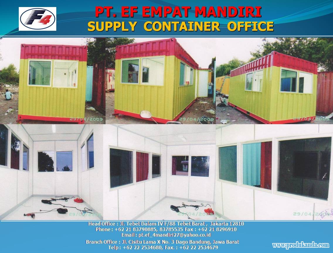 Dapatkan Spesifikasi Harga SALE AND RENTAL CONTAINER OFFICE Produk Terbaik dari PT. EF EMPAT MANDIRI perusahaan swasta nasional yang bergerak dibidang Jasa perdagangan dan supplier, khususnya pengadaan Lift dan Escallator Building, Service and Sparepart dan Perlengkapan Lainnya
