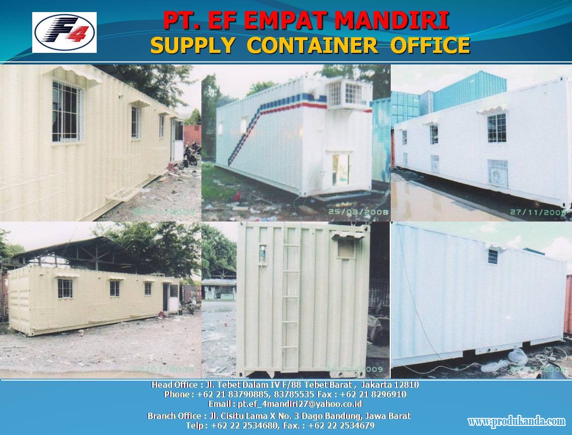 Dapatkan Spesifikasi Harga SALE AND RENTAL CONTAINER OFFICE Produk Terbaik dari PT. EF EMPAT MANDIRI perusahaan swasta nasional yang bergerak dibidang Jasa perdagangan dan supplier, khususnya pengadaan Lift dan Escallator Building, Service and Sparepart dan Perlengkapan Lainnya